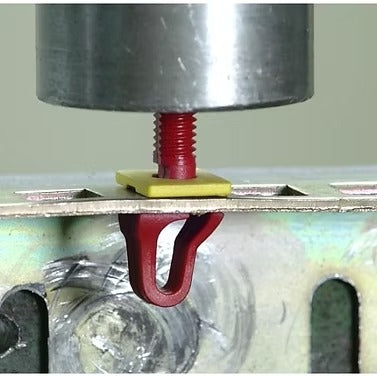 We installed a single Rackstud in a rack mount rail with the lock washer latched. Hydraulic rams pushed the stud through the rail. This would simulate equipment hitting the Rackstuds in a typical equipment loading scenario. We performed two tests to create an average.