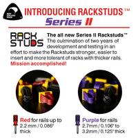 The revolutionary new Series II Rackstuds are a universal replacement for the common cage nut. If you use cage nuts to mount IT, Pro A/V, Security or Telecommunications equipment in 19" racks, you're going to love Rackstuds. Suitable for most* 19" racks with square punched vertical rails, Rackstuds go in from the front and provide you with a place to hang your equipment while spinning on the lock nut. This makes mounting even heavy equipment much easier; even if you're on your own.